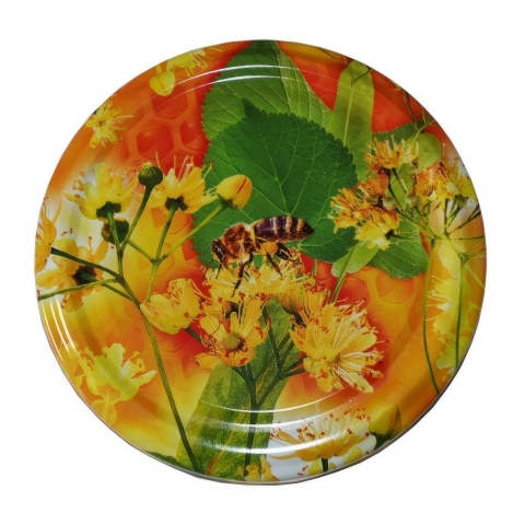 Šroubovací víčko vzor včela nalípě na sklenice Včela 770 ml, Facette 720 ml, Fass 720 ml, Facette 580 ml a Facette 420 ml. Graficky velmi pěkně zpracované víčko pro standardní sklenice, které se používají pro med.