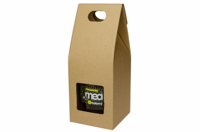 Je vyrobena formou odnosné tašky s průhledy na etiketu z kvalitní hnědé mikrovlnné lepenky.